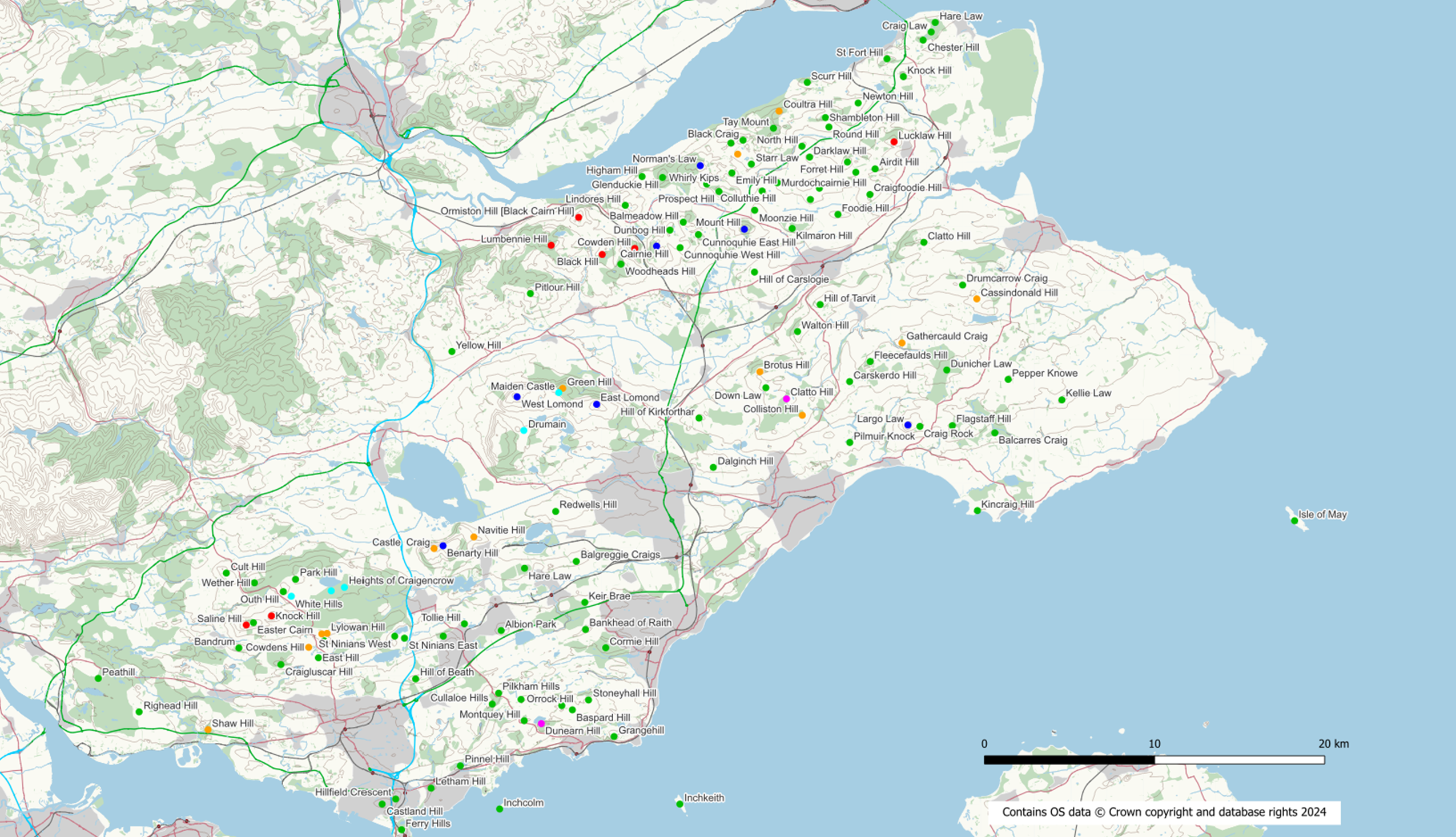 The following list includes those “hills” that are included in the Marilyn, Humps, Tumps, Sub-Tumps and TumpBeag lists. If a hill is not listed here either it is not in Fife or it does not appear in one of the lists.
