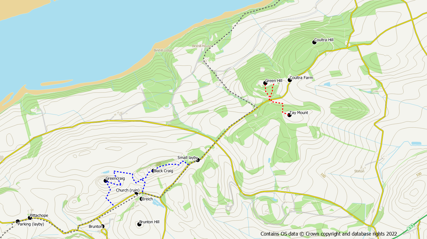 Hills: Black Craig (203m), Green Craig (189m), Tay Mount (189m), Green Hill (186m), Coultra Hill (178m), Brunton Hill (153m)