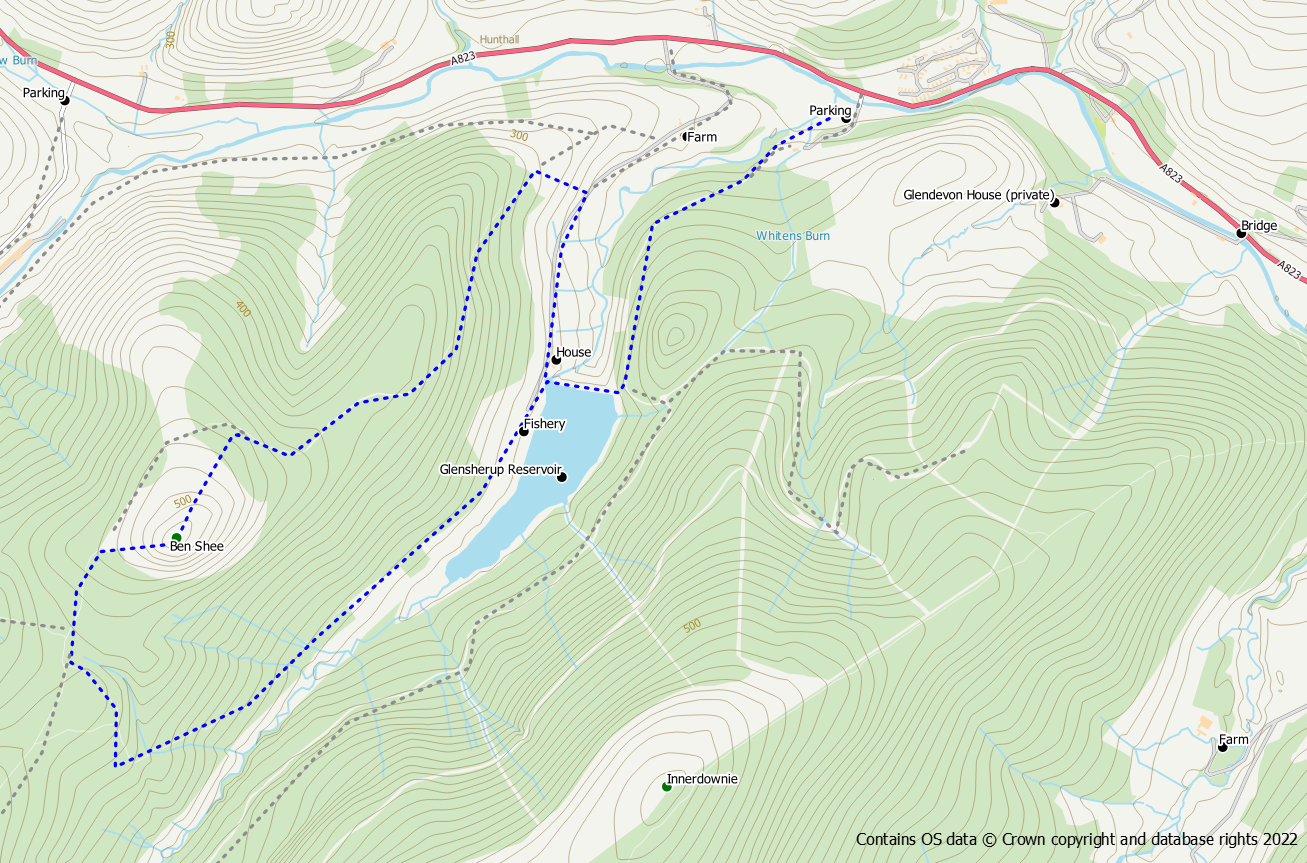 From the car park there is a path next to the information board that takes you into the forest to join the main forest track. After almost 1km on the forest track you will reach a signpost for the Glendevon Reservoir Trail. Go right here off the main track, down the hillside to the Glensherup Reservoir dam. Ben Shee is the prominent hill directly across the reservoir. Cross over the dam and the outflow then go up hill slightly on the opposite side to join a water authority road. Go left onto this road to reach the fishery car park.