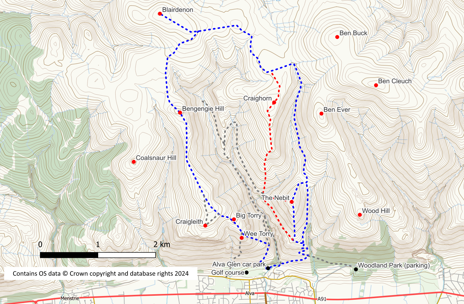 - Start / finish: Alva Glen car park (grid reference NS 884 974)