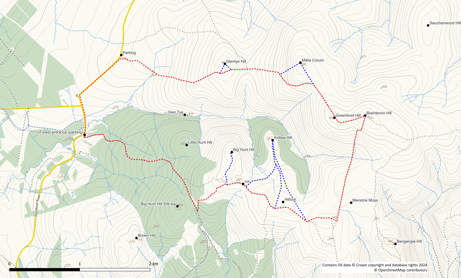 Optional Hills: Big Hunt Hill (521.2m), Kidlaw Hill (510m), Mickle Corum (594m), Glentye Hill (481.5m)