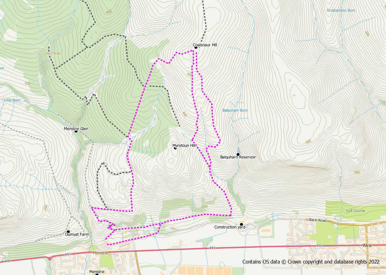 - Start / finish: Menstrie, Ochil Row, FK11 7BP.