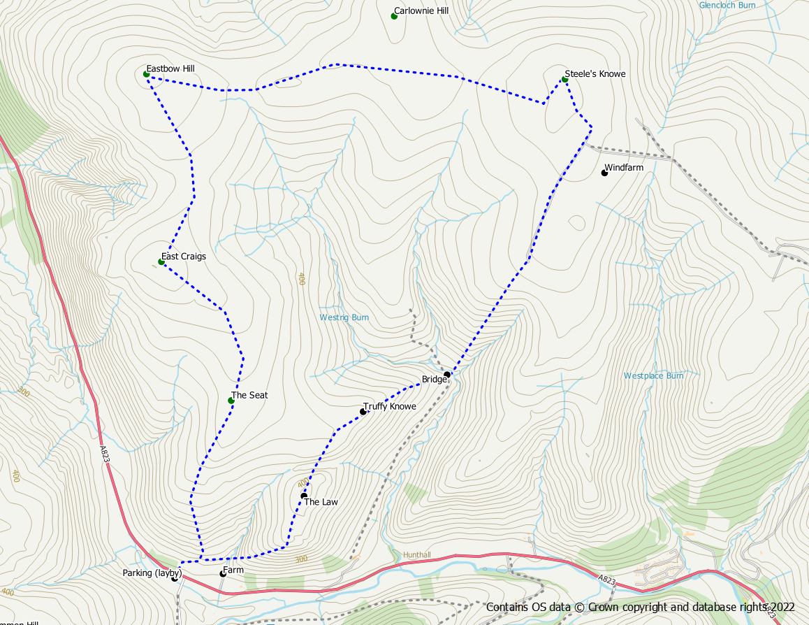 - Start / finish: Layby on A823 opposite Glendevon Reservoirs road, north of Glendevon, grid ref NN 948 052