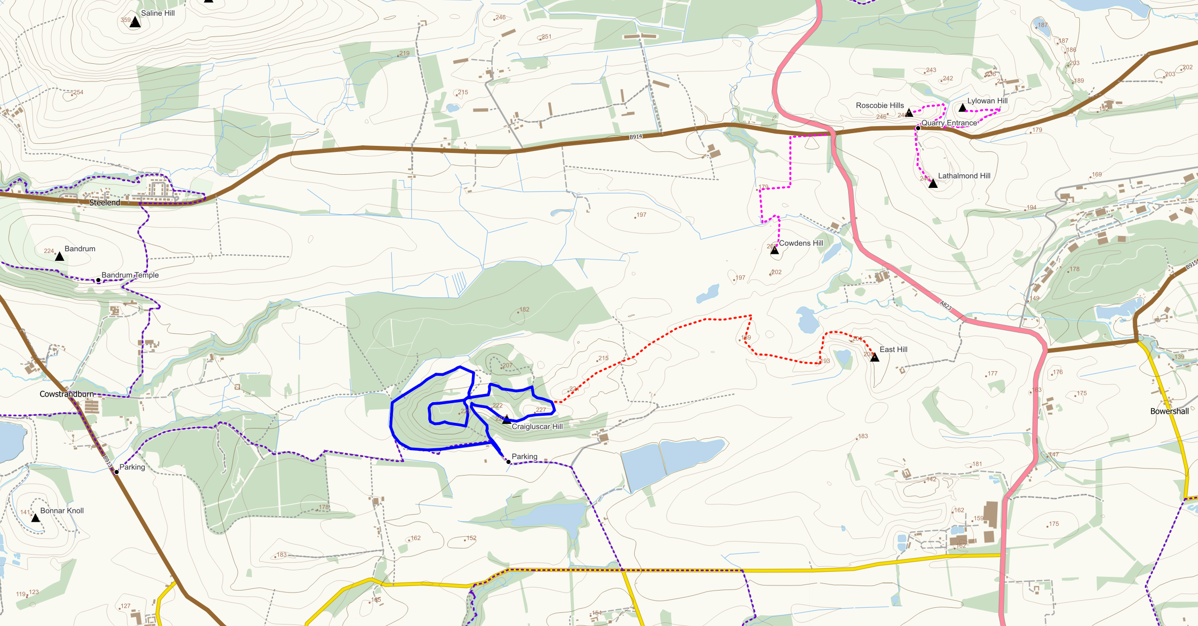 Blue: Craigluscar Hill route; Red: extension (off path) to East Hill, Magenta: off path routes to hills around Lathalmond; Purple: core paths