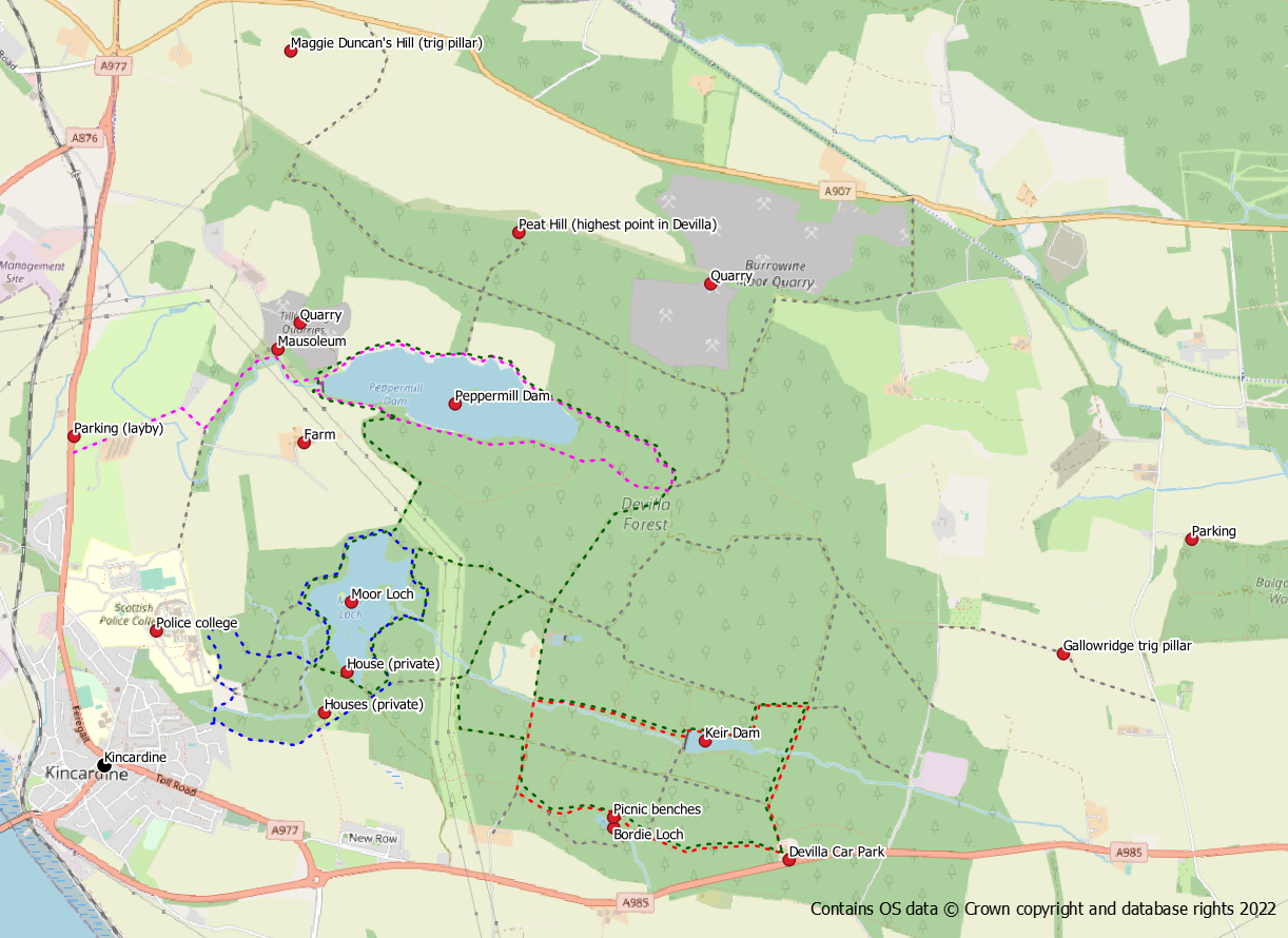Start / finish: Devilla Car Park off A895 near Kincardine – grid ref NS 964 871